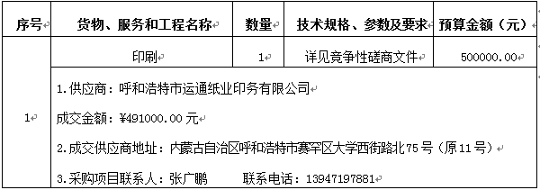 內(nèi)蒙古協(xié)眾工程項目管理有限責任公司受國家稅務(wù)總局呼和浩特市稅務(wù)局的委托,于2019年05月27日在中國招標投標公共服務(wù)平臺(http://www.cebpubservice.com/)、內(nèi)蒙古招標投標公共服務(wù)平臺(http://zbgg.nmgztb.com.cn//)、內(nèi)蒙古協(xié)眾工程項目管理有限責任公司網(wǎng)(http://www.envoi-fax.com)發(fā)布資格預(yù)審公告。于2019年06月13日就國家稅務(wù)總局呼和浩特市稅務(wù)局印刷服務(wù)( UPFW-190520 )采用競爭性磋商方式進行招標?,F(xiàn)就本次采購的成交結(jié)果公告如下。